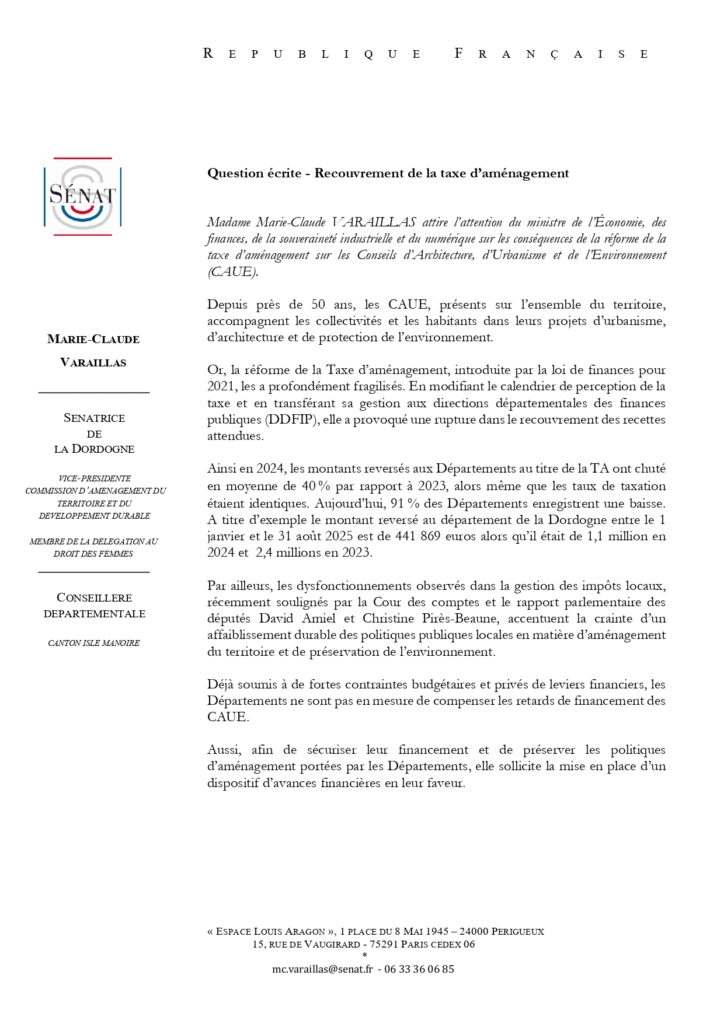 Face à cette situation préoccupante, j’ai interpellé le ministre de l’économie, des finances et de la souveraineté industrielle, énergétique et numérique afin de sécuriser les ressources des CAUE et d’éviter un affaiblissement durable des politiques publiques locales en matière d’urbanisme et d’environnement.