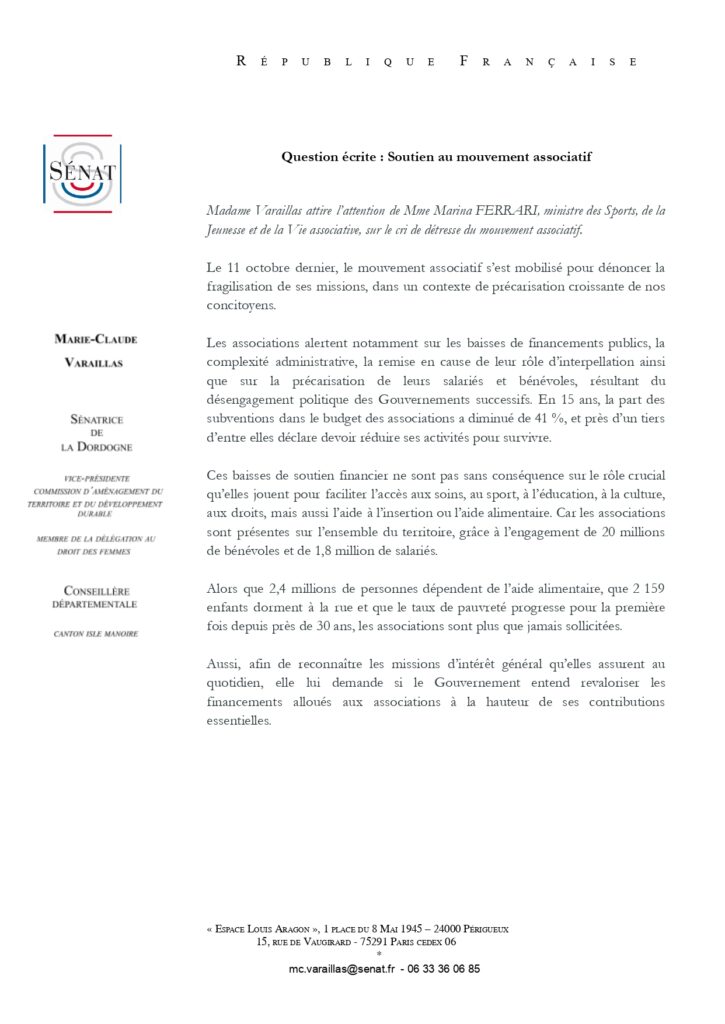J’ai interpellé la ministre des Sports, de la Jeunesse et de la Vie associative sur la situation alarmante que traverse le monde associatif. Partout sur le territoire, les associations tirent la sonnette d’alarme face à la baisse des financements publics, à la complexité administrative croissante et à la précarisation de leurs salariés et bénévoles. Pourtant, elles jouent un rôle essentiel pour maintenir le lien social, accompagner les plus fragiles, favoriser l’accès au sport, à la culture ou à l’éducation. Dans un contexte où la pauvreté progresse et où les besoins explosent, il est indispensable que l’État reconnaisse et soutienne à la hauteur de leurs missions celles et ceux qui, chaque jour, font vivre la solidarité.