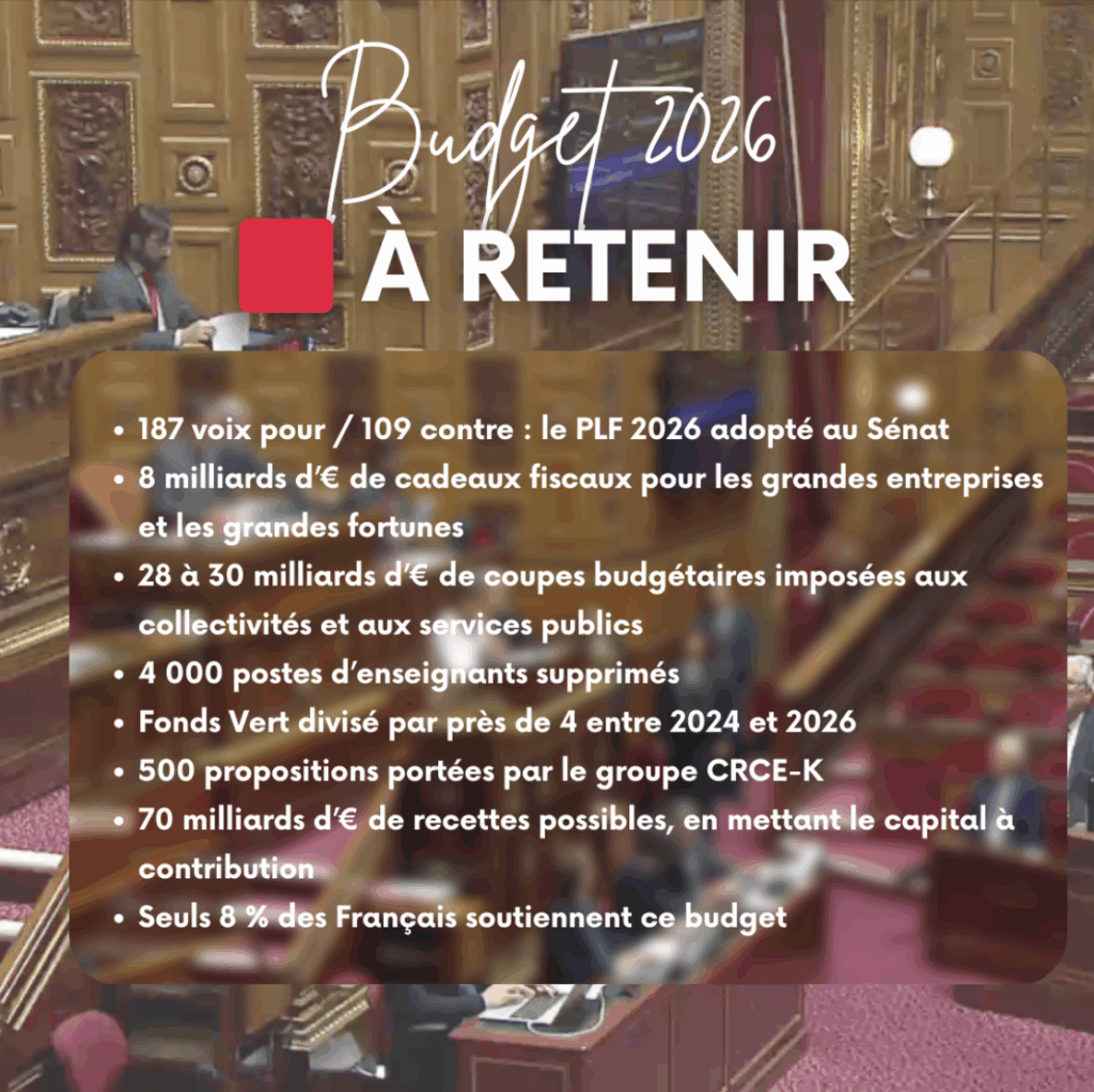 Je reste avec mon groupe CRCE-K pleinement mobilisé pour défendre une autre vision du budget : un budget au service de la justice fiscale, des services publics, des collectivités territoriales et de la transition écologique.