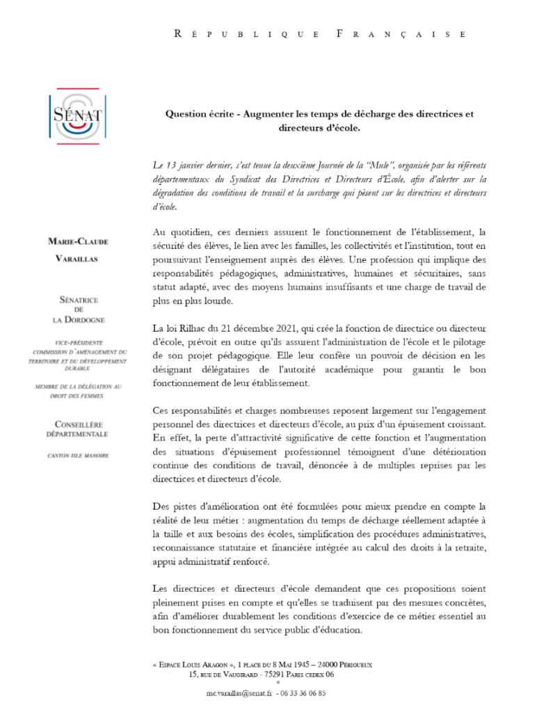 Interpellée par les directrices et directeurs d’école de notre département sur la surcharge de travail importante qui pèse sur eux au quotidien, j’ai relayé leurs préoccupations ainsi que leurs propositions auprès du ministre de l’Éducation nationale, afin que leurs besoins et leur engagement soient pris en considération.