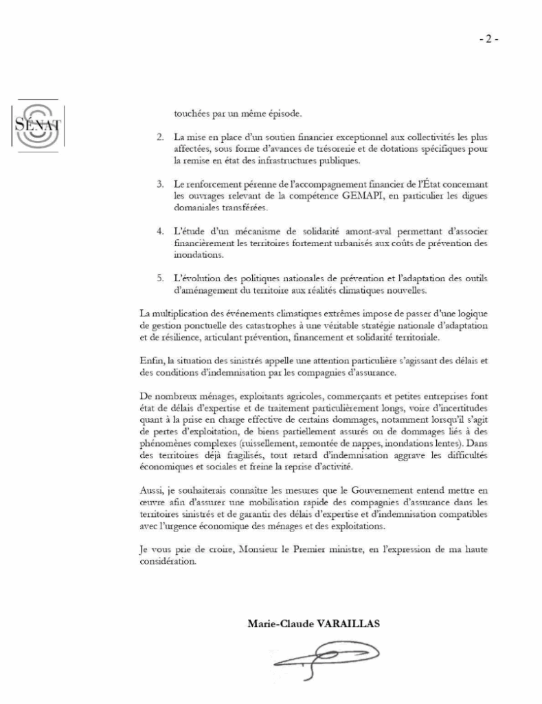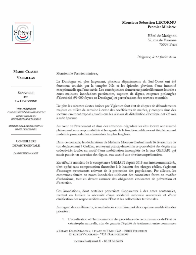 Alors que la Dordogne a été durement touchée, ainsi que de nombreuses communes du Sud-Ouest, par des inondations majeures, digues fragilisées, exploitations agricoles sinistrées, coupures d’électricité encore en cours, j’ai saisi le Premier ministre dès le 17 février pour lui demander :